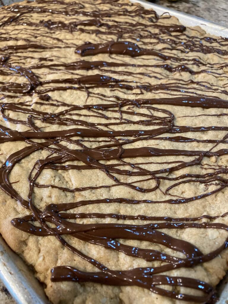- In a small saucepan (or a bowl in the microwave for 30 seconds), melt chocolate chips. Stir in peanut butter. Spread or drizzle on top of warm bars, then refrigerate until chocolate is set.